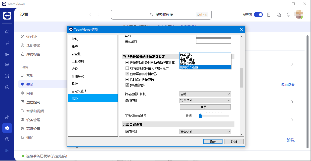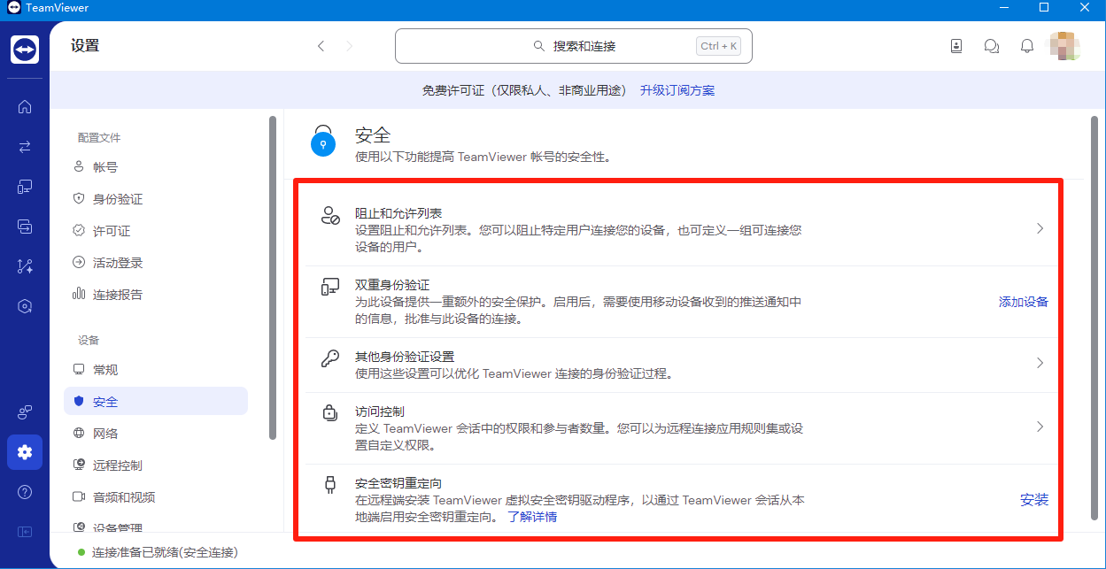 TeamViewer的安全设置主要分布在左侧安全栏,包含阻止和允许列表、双重身份验证、其他身份验证、访问控制和安全密钥重定向。