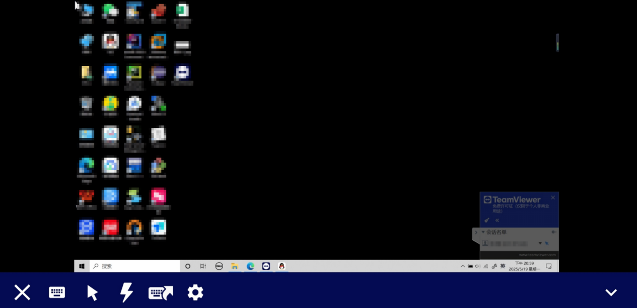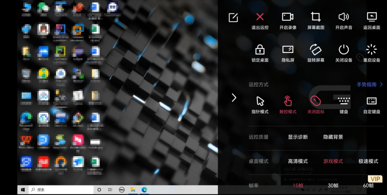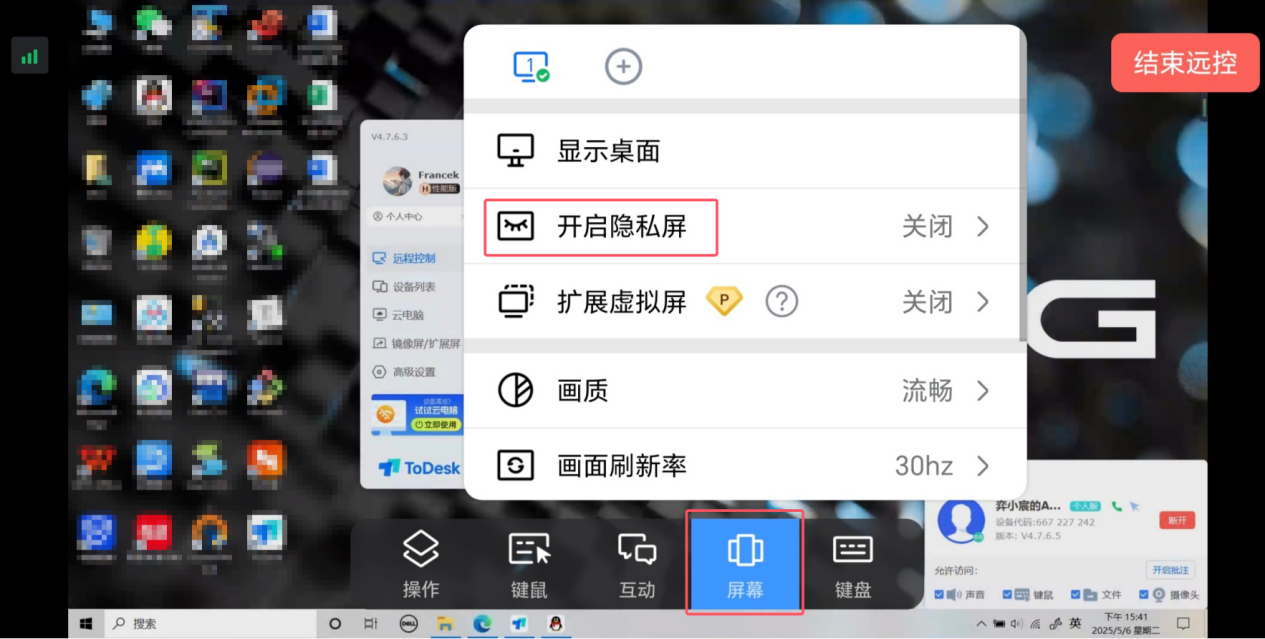 下面这是使用 Android 手机端(主控机)远程控制 Windows 电脑端(被控机)的界面。而且还发现了一个强大的功能——隐私屏。在手机端可以点击“屏幕”选项,再“开启隐私屏”。当我们在主控机开启隐私屏后,主控机不会发生变化,可以正常进行控制操作。