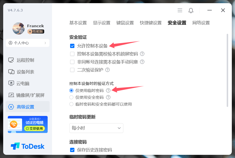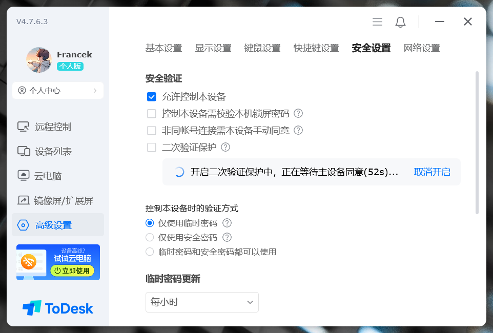 此外还提供了常规的临时密码设置,有五种更新频率:手动、每1小时、每12小时、每日、每次远控后,用户可以根据使用场景选择,分享远控连接的建议选择高频更新,这样可以更好地保障密码设置。