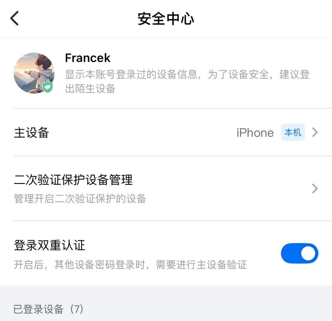 “二次验证保护”也可以随时关闭、解绑和换绑,这些操作都需要经过主设备同意才可以修改。同时,我们可以开启登录双重认证,是主设备附加的认证功能,控制的是远程设备的登录需经过密码和主设备的双重验证授权。
