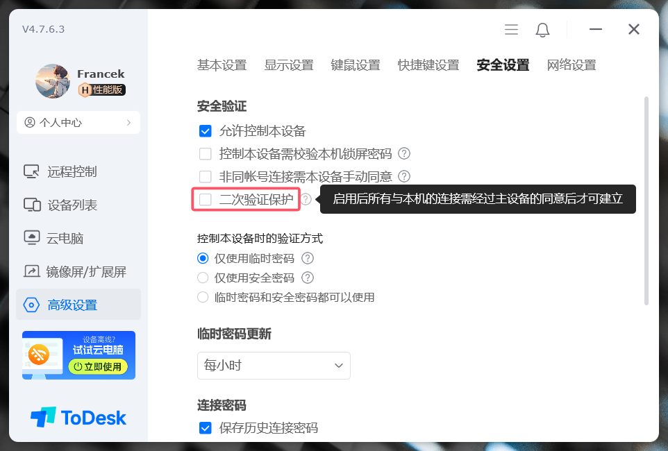 ToDesk 不仅在基础性能与功能拓展上表现卓越,更为用户免费提供了高级别的安全远控体验。其独具创新性的“二次验证保护”功能极具创新性与实用性,堪称其为最安全远控软件的核心支撑。该功能在登录及远程连接环节增设验证步骤,只有授权用户才能访问账户或设备,每次连接都需经使用者同意,启用后所有与本机的连接需经过主设备的同意后才可以建立,等于多加了一个主设备同意的验证。