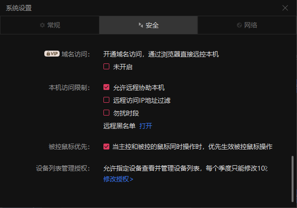 向日葵的访问主要也是对本机和域名的控制,比较不一样的是对访问IP地址过滤和勿扰时段设置。
