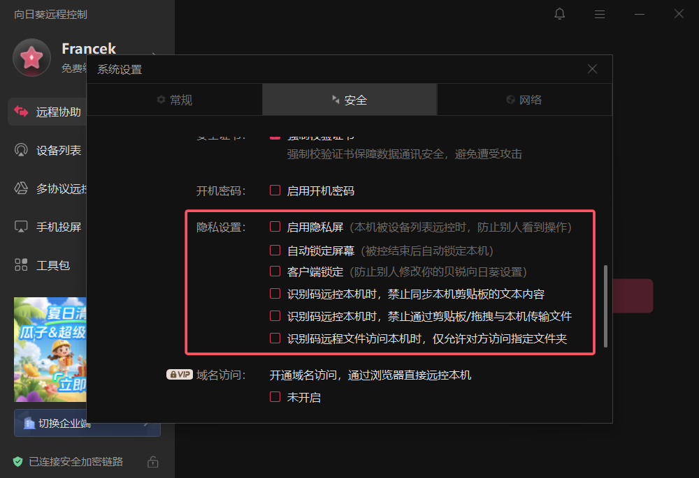 但是设置的校验和保护还不够丰富,类似 ToDesk 的强隐私模式、非同账号连接自动锁定客户端等没有看到。