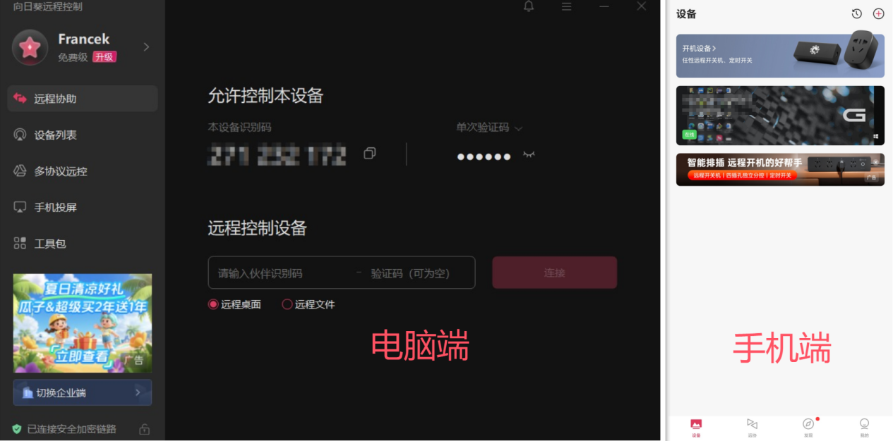 向日葵远程控制是上海贝锐开发的提供远程控制服务软件,于 2009 年正式上线。主要提供跨端远程控制解决方案,支持跨平台(Windows/macOS/Android/iOS)远程桌面控制,相比 ToDesk 少了TV版兼容。可支持手机/电脑双向操控,满足异地协助、设备调试及远程教学需求,支持屏幕共享、语音沟通、文件传输、硬件联动开关机、Linux/命令行等高效协作功能,是远控软件的同时也售卖自家品牌的硬件。