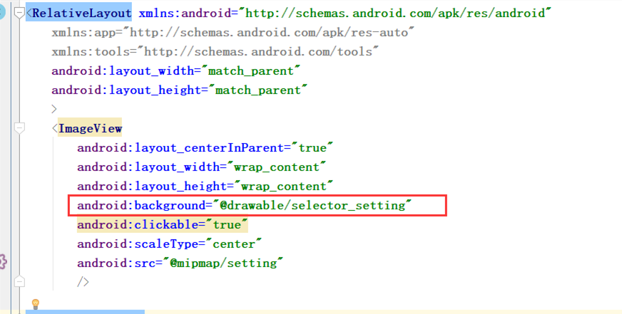 在控件中设置背景为selector_setting:(记得加clickable标签----->设置是否可以点击)