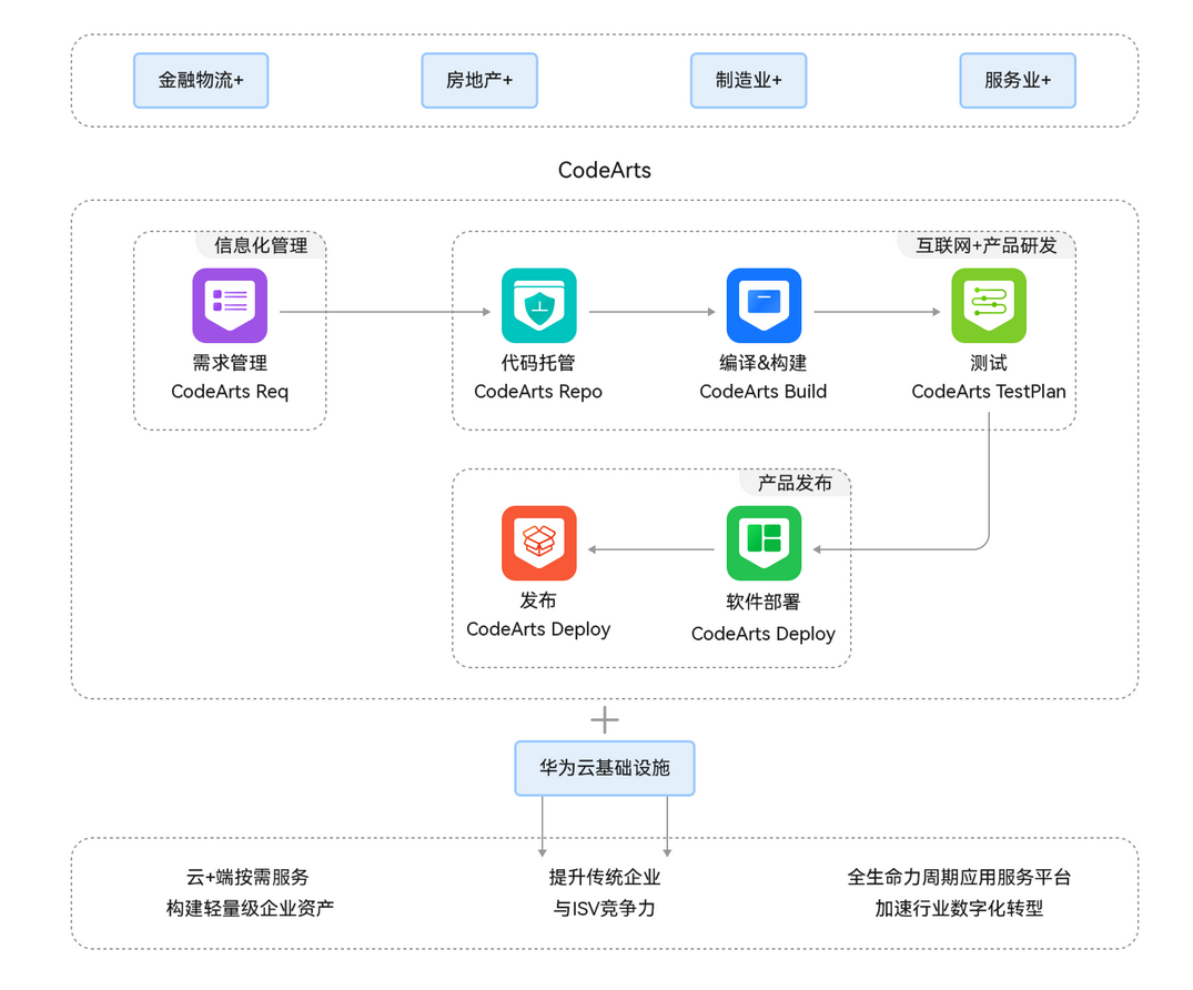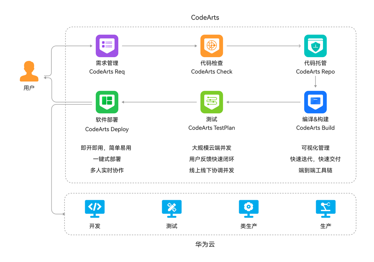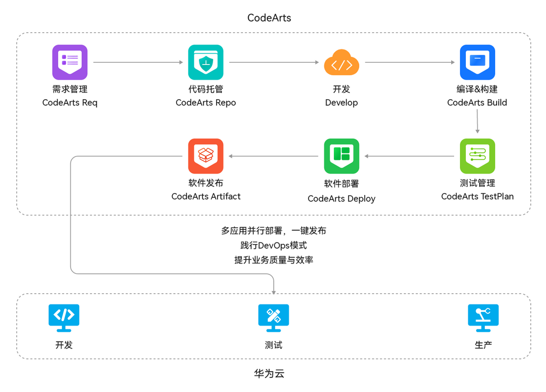 CodeArts 平台提供完整的研发工具链,与 CI/CD 深度集成: