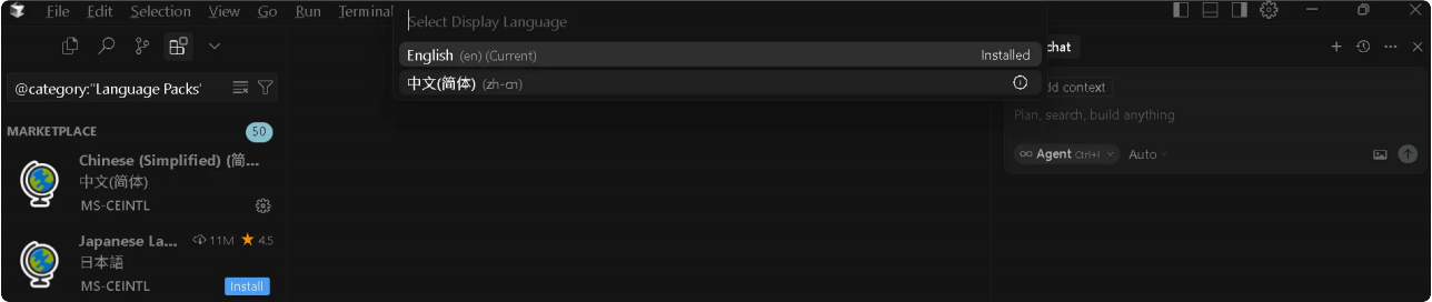 点击 Ctrl + shift + p ,输⼊命令:configure display language, 选择 中⽂(简体)