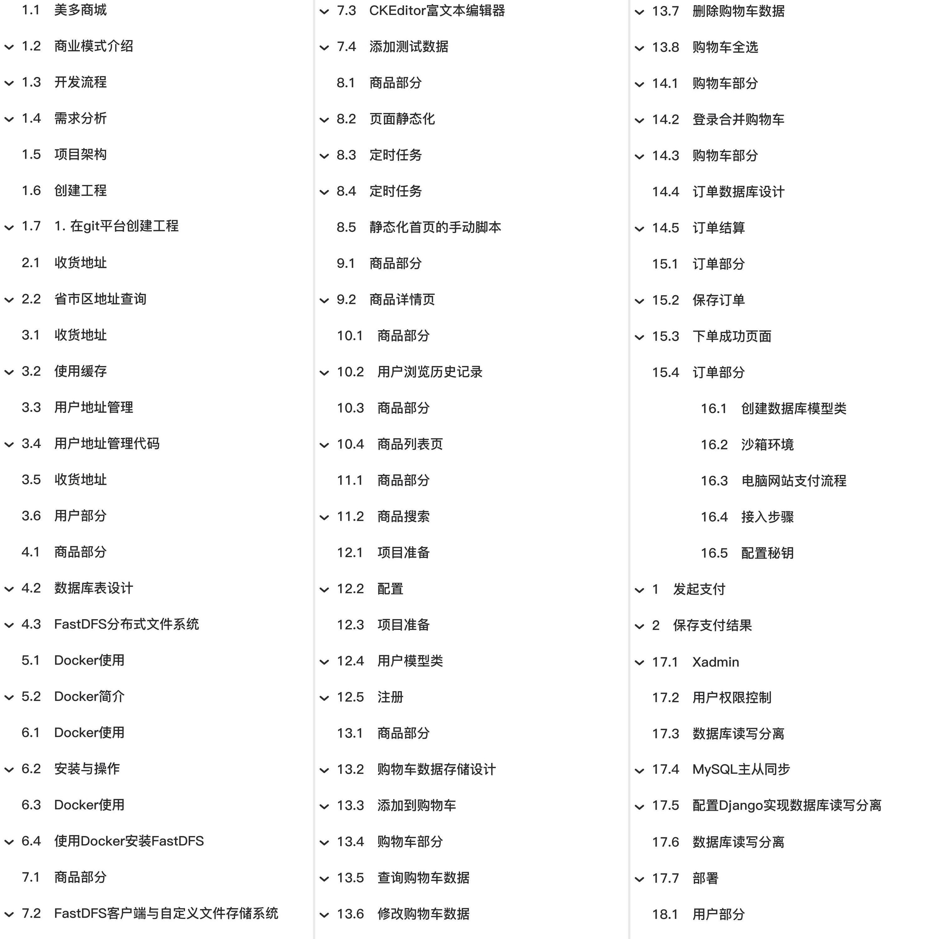 教程总体简介:美多商城 商业模式介绍 1.B2B--企业对企业 2.C2C--个人对个人 5.O2O--线上到线下 开发流程 说明: 需求分析 1. 用户部分 注册 登录 个人信息 地址管理 修改密码 3. 购物车部分 购物车管理 项目架构 创建工程 1. 在git平台创建工程 2. 添加前端文件 合并 3. 创建Django REST framework工程 4. 修改manage.py 5. 创建数据库 收货地址 省市区地址查询 数据库建表 后端接口设计 前端 使用缓存 安装 使用方法 为省市区视图添加缓存 缓存数据保存位置与有效期的设置 用户地址管理代码 后端 商品部分 数据库表设计 表结构 数据库模型类 FastDFS分布式文件系统 1. 什么是FastDFS 2. 文件上传流程 Docker使用 安装与操作 1. 在Ubuntu中安装Docker 2. 启动与停止 3. Docker镜像操作 5. 将容器保存为镜像 6. 镜像备份与迁移 使用Docker安装FastDFS 1. 获取镜像 2. 运行tracker 3. 运行storage CKEditor富文本编辑器 1. 安装 3. 添加CKEditor设置 5. 为模型类添加字段 6. 修改Bug 添加测试数据 在admin中注册模型类 添加FastDFS保存的测试图片数据 添加对应的数据库测试数据 页面静态化 注意 定时任务 添加应用 设置任务的定时时间 静态化首页的手动脚本 商品详情页 异步任务的触发 脚本工具 用户浏览历史记录 2. 查看 商品搜索 2. 搜索引擎原理 3. Elasticsearch 4. 使用Docker安装Elasticsearch及其扩展 6. 前端 项目准备 配置 1. 修改settings/dev.py 文件中的路径信息 2. INSTALLED_APPS 4. Redis 5. 本地化语言与时区 7. 异常处理 用户模型类 Django用户模型类 创建自定义的用户模型类 购物车数据存储设计 1. Redis保存已登录用户 添加到购物车 2. 后端实现 查询购物车数据 登录合并购物车 修改登录视图 订单结算 订单部分 保存订单 4. 使用乐观锁改写下单逻辑 5. 需要修改MySQL的事务隔离级别 下单成功页面 前端文件 沙箱环境 电脑网站支付流程 接入步骤 配置秘钥 发起支付 保存支付结果 Xadmin 用户权限控制 数据库读写分离 MySQL主从同步 1. 主从同步的定义 3. 配置主从同步的基本步骤 4. 详细配置主从同步的方法 配置Django实现数据库读写分离 2. 创建数据库操作的路由分发类 部署 1. 静态文件 2. 动态接口 图片验证码 3. 设置域名 4. 前端Vue代码: 跨域CORS 使用Celery完成发送短信 判断帐号是否存在 1. 判断用户名是否存在 JWT 什么是JWT 起源 传统的session认证 基于token的鉴权机制 JWT长什么样? JWT的构成 header playload signature 如何应用 urllib使用说明 绑定用户身份接口 用户中心个人信息 邮件与验证 使用Django发送邮件 保存邮箱并发送验证邮件 验证邮箱链接
