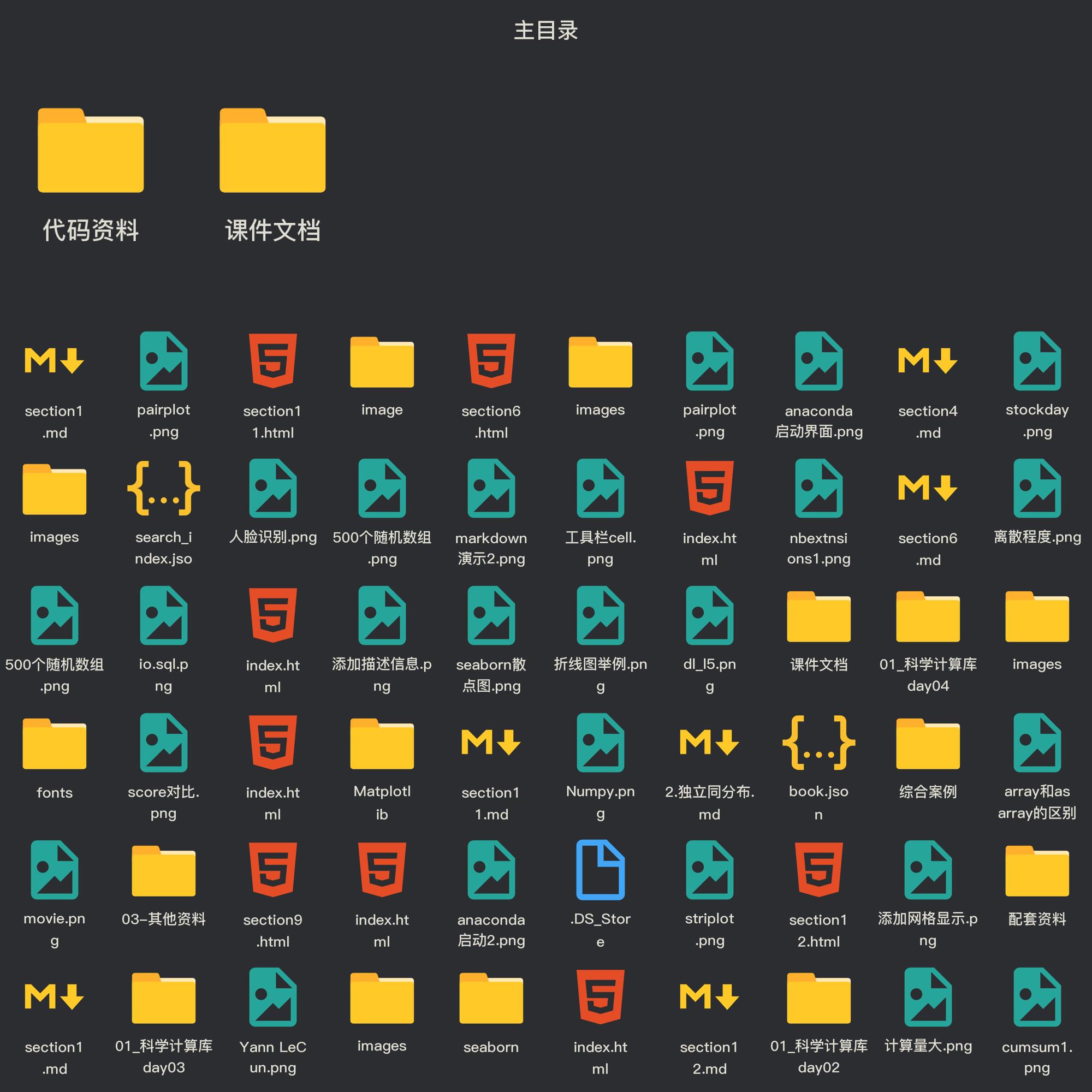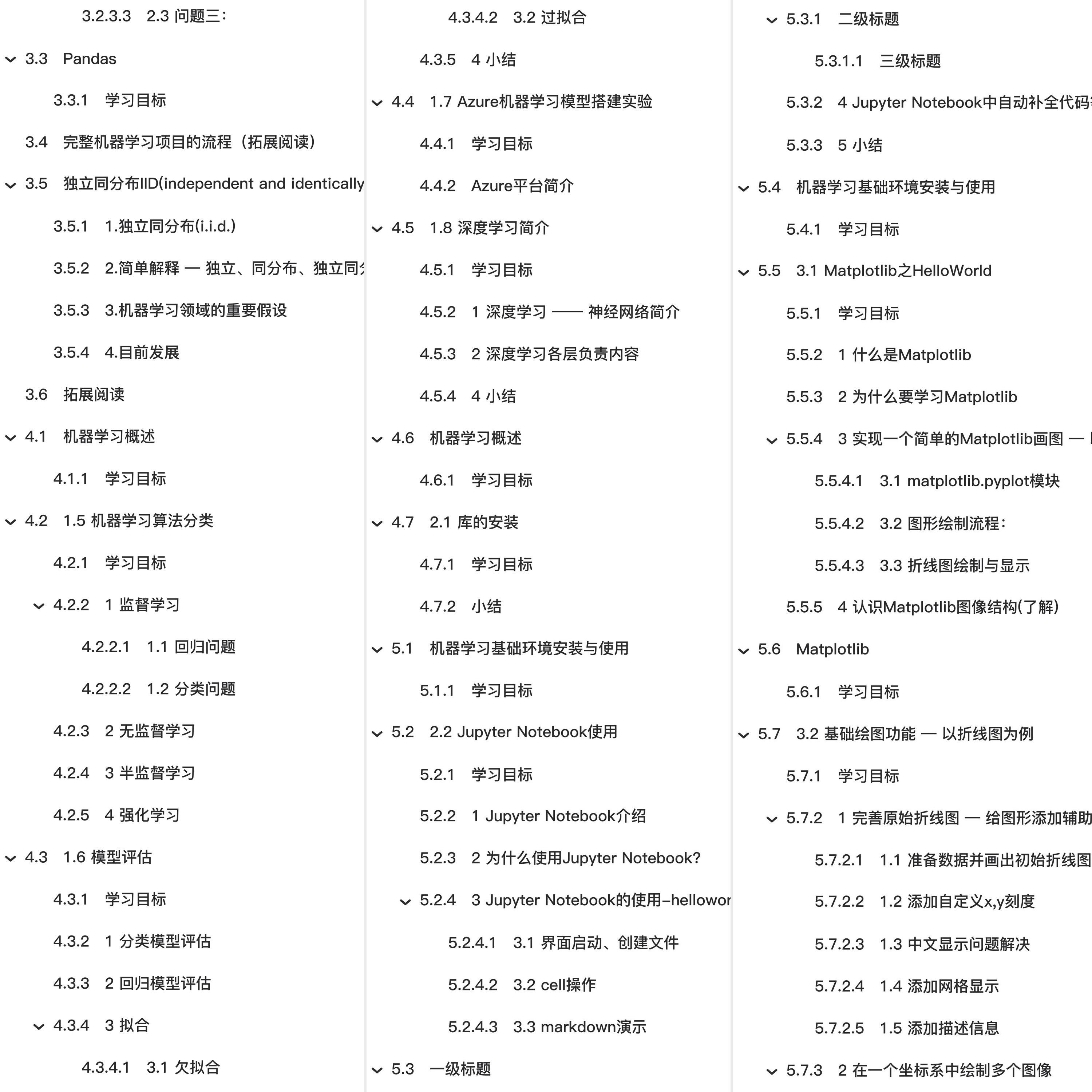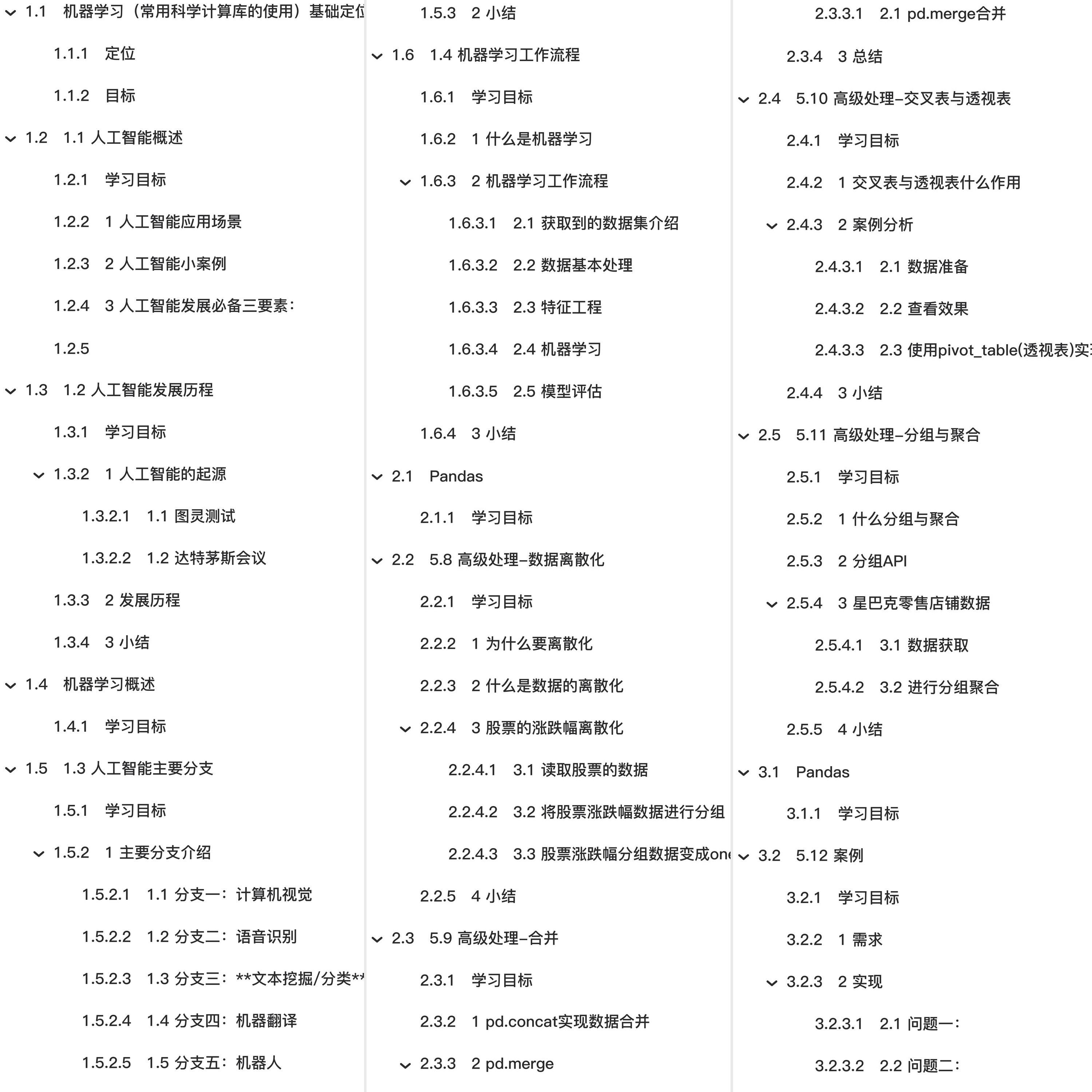 教程总体简介:机器学习(常用科学计算库的使用)基础定位、目标 定位 目标 1.1 人工智能概述 学习目标 1 人工智能应用场景 2 人工智能小案例 3 人工智能发展必备三要素: 4 人工智能、机器学习和深度学习 4 小结 机器学习概述 1.4 机器学习工作流程 1 什么是机器学习 Pandas 5.8 高级处理-数据离散化 1 为什么要离散化 2 什么是数据的离散化 3 股票的涨跌幅离散化 3.1 读取股票的数据 3.2 将股票涨跌幅数据进行分组 3.3 股票涨跌幅分组数据变成one-hot编码 5.10 高级处理-交叉表与透视表 1 交叉表与透视表什么作用 2 案例分析 2.1 数据准备 2.2 查看效果 2.3 使用pivot_table(透视表)实现 5.12 案例 1 需求 2 实现 2.1 问题一: 完整机器学习项目的流程(拓展阅读) 独立同分布IID(independent and identically distributed) 1.独立同分布(i.i.d.) 2.简单解释 — 独立、同分布、独立同分布 3.机器学习领域的重要假设 4.目前发展 拓展阅读 1.6 模型评估 2 回归模型评估 3 拟合 1.7 Azure机器学习模型搭建实验 Azure平台简介 1.8 深度学习简介 1 深度学习 —— 神经网络简介 2 深度学习各层负责内容 2.1 库的安装 小结 机器学习基础环境安装与使用 2.2 Jupyter Notebook使用 一级标题 4 Jupyter Notebook中自动补全代码等相关功能拓展【了解】 3.1 Matplotlib之HelloWorld 1 什么是Matplotlib 3 实现一个简单的Matplotlib画图 — 以折线图为例 3.2 图形绘制流程: 3.3 折线图绘制与显示 4 认识Matplotlib图像结构(了解) 3.2 基础绘图功能 — 以折线图为例 1 完善原始折线图 — 给图形添加辅助功能 1.1 准备数据并画出初始折线图 1.2 添加自定义x,y刻度 1.3 中文显示问题解决 1.4 添加网格显示 1.5 添加描述信息 1.6 图像保存 2 在一个坐标系中绘制多个图像 2.1 多次plot 2.2 设置图形风格 2.3 显示图例 2.4 练一练 3 多个坐标系显示— plt.subplots(面向对象的画图方法) 4 折线图的应用场景 3.3 常见图形绘制 1 常见图形种类及意义 2 散点图绘制 4.1 Numpy优势 2 ndarray介绍 3 ndarray与Python原生list运算效率对比 Numpy 4.2 N维数组-ndarray 4.3 基本操作 1 生成数组的方法 1.1 生成0和1的数组 1.2 从现有数组生成 2 数组的索引、切片 3 形状修改 3.1 ndarray.reshape(shape, order) 4 类型修改 4.2 ndarray.tostring([order])或者ndarray.tobytes([order]) 4.3 jupyter输出太大可能导致崩溃问题【了解】 5 数组的去重 5.1 np.unique() 4.5 数组间运算 1 数组与数的运算 4.6 数学:矩阵 1 矩阵和向量 1.1 矩阵 1.2 向量 2 加法和标量乘法 3 矩阵向量乘法 5 矩阵乘法的性质 6 逆、转置 7 矩阵运算 7.1 矩阵乘法api: 5.2 Pandas数据结构 1.Series 2.DataFrame 3.MultiIndex与Panel 3.2 Panel 5.6 文件读取与存储 1 CSV 1.1 read_csv 2 HDF5 2.1 read_hdf与to_hdf 3 JSON 3.2 read_josn 案例 3.3 to_json