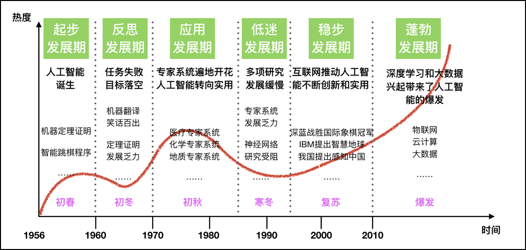 人工智能充满未知的探索道路曲折起伏。如何描述人工智能自1956年以来60余年的发展历程,学术界可谓仁者见仁、智者见智。我们将人工智能的发展历程划分为以下6个阶段: