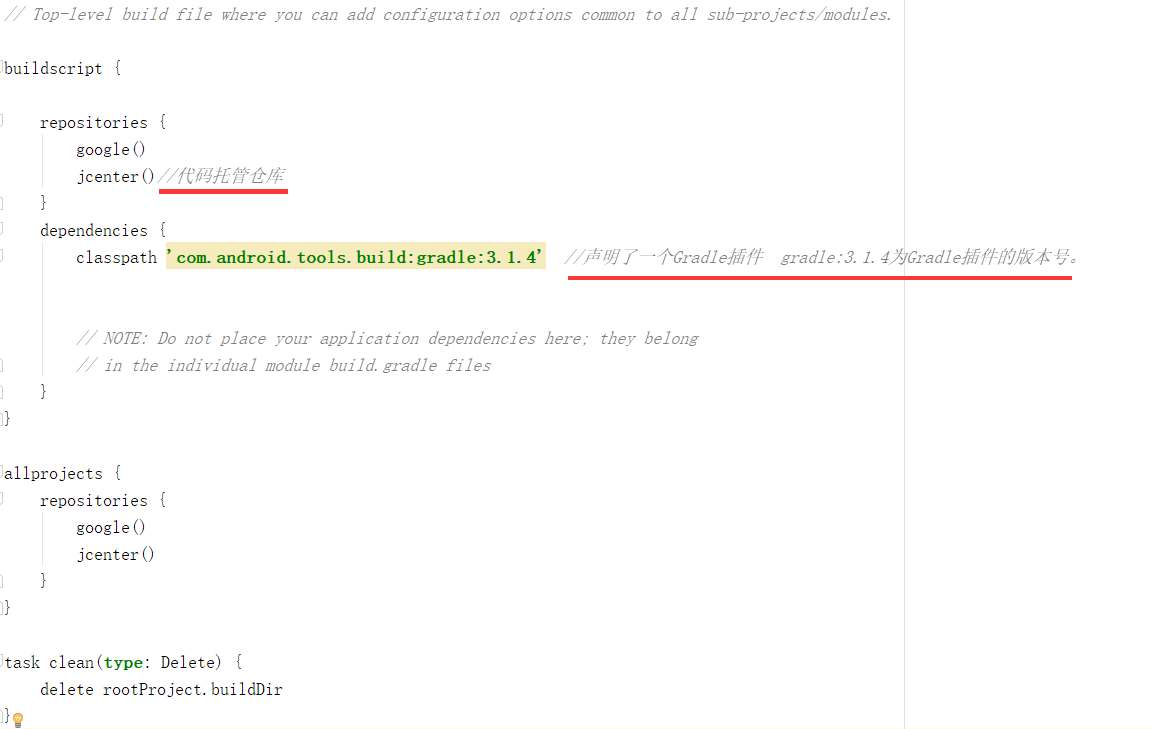 Android每新建一个项目,都会有两个build.gradle文件,有一个在最外层目录下,有一个在app目录下,如果切换到 Android 模式下则全部在 Gradle Scripts下。下面先介绍看起来少的(最外层目录下的)。