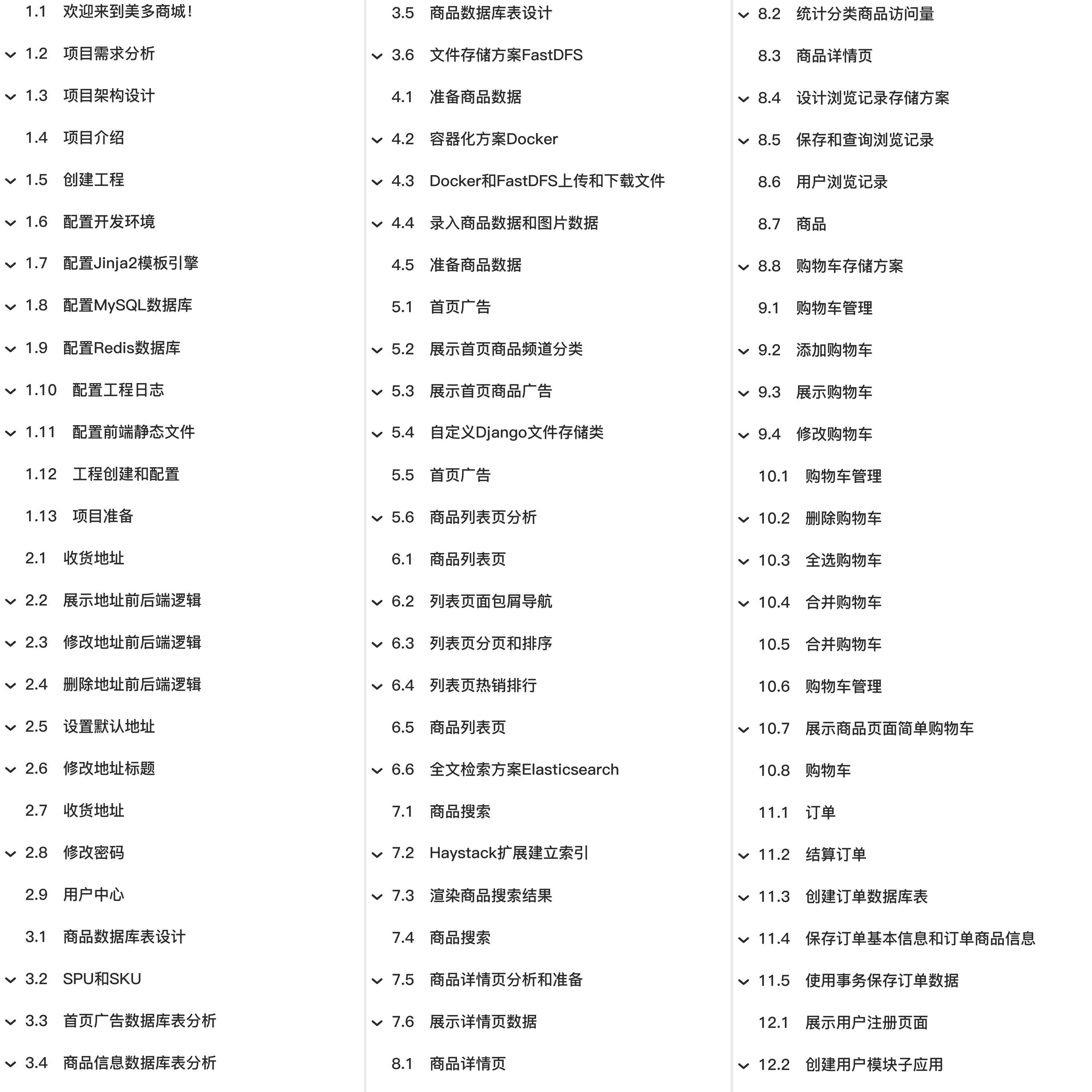 教程总体简介:欢迎来到美多商城! 项目需求分析 1. 项目主要页面介绍 2. 归纳项目主要模块 3. 知识要点 项目架构设计 1. 项目开发模式 2. 项目运行机制 项目介绍 创建工程 1. 准备项目代码仓库 3. 创建美多商城工程 配置开发环境 1. 新建配置文件 2. 指定开发环境配置文件 配置Jinja2模板引擎 1. 安装Jinja2扩展包 配置MySQL数据库 3. 安装PyMySQL扩展包 配置Redis数据库 1. 安装django-redis扩展包 配置工程日志 2. 准备日志文件目录 3. 日志记录器的使用 4. Git管理工程日志 配置前端静态文件 2. 指定静态文件加载路径 工程创建和配置 项目准备 收货地址 展示地址前后端逻辑 1. 展示地址接口设计和定义 设置默认地址 2. 设置默认地址后端逻辑实现 修改地址标题 3. 修改地址标题前端逻辑实现 修改密码 1. 修改密码后端逻辑 用户中心 商品数据库表设计 SPU和SKU 1. SPU介绍 思考 首页广告数据库表分析 2. 定义首页广告模型类 文件存储方案FastDFS 1. FastDFS介绍 准备商品数据 容器化方案Docker 1. Docker介绍 2. Docker安装(ubuntu 16.04) Docker和FastDFS上传和下载文件 1. Docker安装运行FastDFS 3. 浏览器下载并渲染图片 录入商品数据和图片数据 1. SQL脚本录入商品数据 2. FastDFS服务器录入图片数据 首页广告 展示首页商品频道分类 1. 分析首页商品频道分类数据结构 自定义Django文件存储类 1. Django文件存储类url()方法介绍 商品列表页分析 1. 商品列表页组成结构分析 列表页面包屑导航 列表页分页和排序 列表页热销排行 1. 查询列表页热销排行数据 全文检索方案Elasticsearch 1. 全文检索和搜索引擎原理 3. 使用Docker安装Elasticsearch 商品搜索 Haystack扩展建立索引 1. Haystack介绍和安装配置 3. 全文检索测试 渲染商品搜索结果 1. 准备商品搜索结果页面 商品详情页分析和准备 3. 商品详情页初步渲染 展示详情页数据 1. 查询和渲染SKU详情信息 3. 查询和渲染详情、包装和售后信息 商品详情页 统计分类商品访问量 设计浏览记录存储方案 1. 存储数据说明 保存和查询浏览记录 1. 保存用户浏览记录 商品 购物车存储方案 1. 登录用户购物车存储方案 购物车管理 添加购物车 展示商品页面简单购物车 订单 结算订单 1. 结算订单逻辑分析 4.结算订单页面渲染 创建订单数据库表 2. 订单模型类迁移建表 保存订单基本信息和订单商品信息 2. 保存订单基本信息 使用事务保存订单数据 1. Django中事务的使用 展示用户注册页面 创建用户模块子应用 2. 查看项目导包路径 追加导包路径 2. 重新注册用户模块应用 定义用户模型类 2. Django默认用户模型类 用户注册业务逻辑分析 用户注册接口设计和定义 1. 设计接口基本思路 2. 用户注册接口设计 提交订单 使用乐观锁并发下单 1. 并发下单问题演示和解决方案 3. MySQL事务隔离级别 展示提交订单成功页面 我的订单 订单支付功能 保存订单支付结果 评价订单商品 详情页展示评价信息 支付 页面静态化 MySQL读写分离 性能优化 状态保持 1. login()方法介绍 3. 查看状态保持结果 用户名重复注册 1. 用户名重复注册逻辑分析 图形验证码逻辑分析 容联云通讯短信平台 2. 容联云通讯短信SDK测试 3. 封装发送短信单例类 短信验证码后端逻辑 1. 短信验证码接口设计 补充注册时短信验证逻辑 避免频繁发送短信验证码 pipeline操作Redis数据库 1. pipeline的介绍 生产者消费者设计模式 RabbitMQ介绍和使用 3. 新建administrator用户 4. RabbitMQ配置远程访问 Celery介绍和使用 2. 创建Celery实例并加载配置 4. 启动Celery服务 5. 调用发送短信任务 6. 补充celery worker的工作模式 异步方案RabbitMQ和Celery 验证码 账号登录 用户名登录 3. 用户名登录接口定义 首页用户名展示 2. 用户名写入到cookie 3. Vue渲染首页用户名 退出登录 判断用户是否登录 1. 展示用户中心界面 2. is_authenticate 判断用户是否登录 3. login_required装饰器 判断用户是否登录 4. 登录时next参数的使用 1. 定义模型类基类 OAuth2.0认证获取openid 2. 接收Authorization Code 4. 本机绑定www.meiduo.site域名 openid是否绑定用户的处理 1. 判断openid是否绑定过用户 4. 补充itsdangerous的使用 用户基本信息 添加邮箱后端逻辑 3. 判断用户是否登录并返回JSON Django发送邮件的配置 2. 准备发邮件服务器 发送邮箱验证邮件 1. 定义和调用发送邮件异步任务 2. 生成邮箱验证链接 添加和验证邮箱 省市区三级联动 2. 准备省市区模型和数据