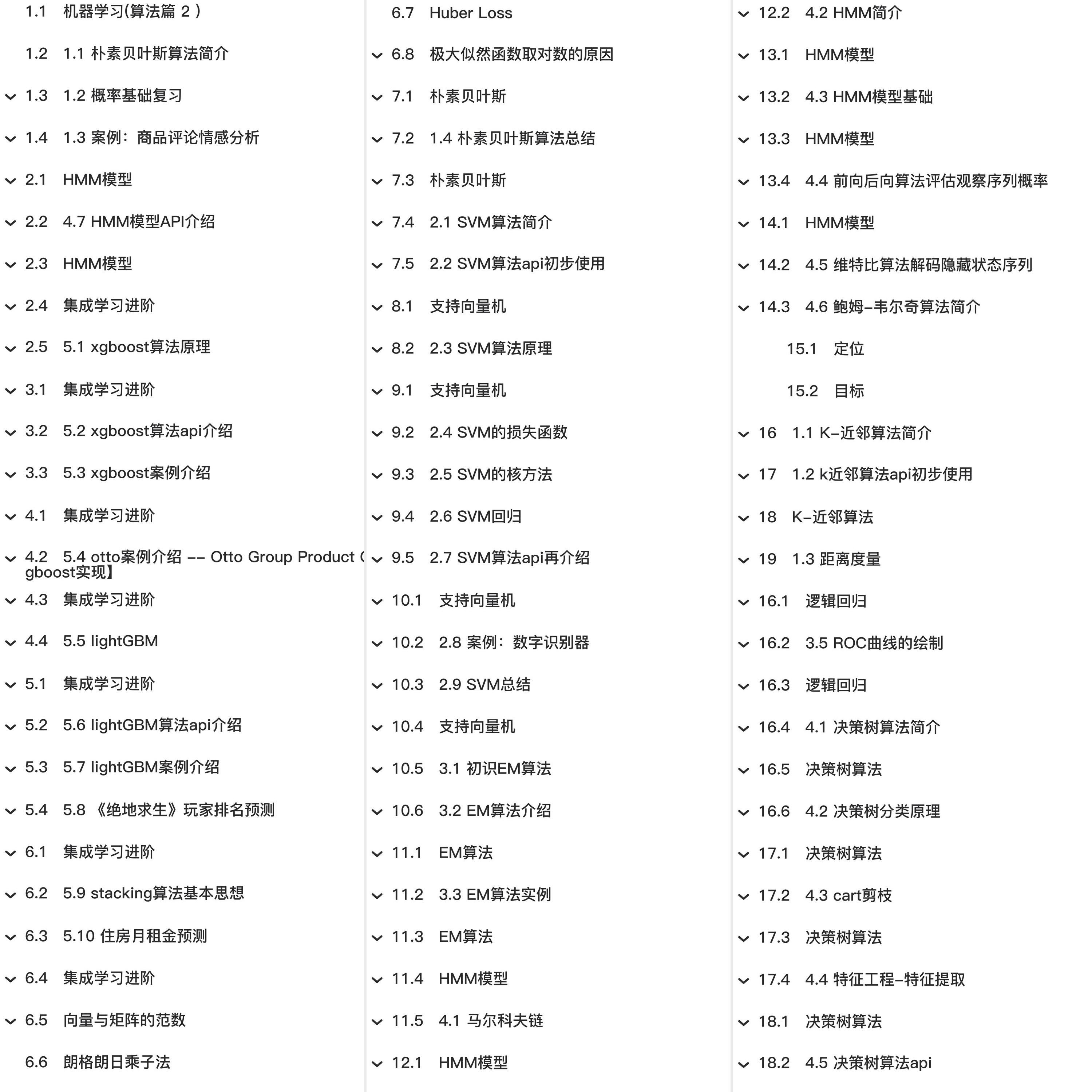 教程总体简介:机器学习(算法篇 2 ) 1.1 朴素贝叶斯算法简介 1.2 概率基础复习 学习目标 1.概率定义 2.案例:判断女神对你的喜欢情况 3.联合概率、条件概率与相互独立 4.贝叶斯公式 4.1 公式介绍 4.2 案例计算 4.3 文章分类计算 5 小结 1.3 案例:商品评论情感分析 1.api介绍 HMM模型 4.7 HMM模型API介绍 1 API的安装: 2 hmmlearn介绍 3 MultinomialHMM实例 集成学习进阶 5.1 xgboost算法原理 1 最优模型的构建方法 2 XGBoost的目标函数推导 2.1 目标函数确定 2.2 CART树的介绍 2.3 树的复杂度定义 4 XGBoost与GDBT的区别 5.4 otto案例介绍 -- Otto Group Product Classification Challenge【xgboost实现】 1 背景介绍 2 思路分析 3 部分代码实现 5.5 lightGBM 1 写在介绍lightGBM之前 1.2 AdaBoost算法 1.3 GBDT算法以及优缺点 1.4 启发 5.8 《绝地求生》玩家排名预测 1 项目背景 2 数据集介绍 3 项目评估方式 5.9 stacking算法基本思想 1 集成学习基本复习 3 stacking的特点 5.10 住房月租金预测 2 任务 3 数据 4 评分标准 向量与矩阵的范数 1.向量的范数 朗格朗日乘子法 Huber Loss 极大似然函数取对数的原因 1 减少计算量 2 利于结果更好的计算 3 取对数并不影响最后结果的单调性 朴素贝叶斯 2.2 SVM算法api初步使用 支持向量机 2.3 SVM算法原理 1 定义输入数据 2 线性可分支持向量机 3 SVM的计算过程与算法步骤 3.1 推导目标函数 4 举例 2.4 SVM的损失函数 小结 2.8 案例:数字识别器 3 案例实现 3.1 初识EM算法 3.2 EM算法介绍 1 极大似然估计 1.1 问题描述 1.2 用数学知识解决现实问题 1.3 最大似然函数估计值的求解步骤 2 EM算法实例描述 EM算法 4.1 马尔科夫链 1 简介 2 经典举例 4.2 HMM简介 1 简单案例 2 案例进阶 2.2 问题解决 4.4 前向后向算法评估观察序列概率 1 回顾HMM问题一:求观测序列的概率 2 用前向算法求HMM观测序列的概率 2.1 流程梳理 3 HMM前向算法求解实例 4.5 维特比算法解码隐藏状态序列 1 HMM最可能隐藏状态序列求解概述 2 维特比算法概述 4.6 鲍姆-韦尔奇算法简介 定位 目标 K-近邻算法 1.3 距离度量 1 欧式距离(Euclidean Distance): 3 切比雪夫距离 (Chebyshev Distance): 4 闵可夫斯基距离(Minkowski Distance): 5 标准化欧氏距离 (Standardized EuclideanDistance): 7 汉明距离(Hamming Distance)【了解】: 逻辑回归 3.5 ROC曲线的绘制 1 曲线绘制 1.1 如果概率的序列是(1:0.9,2:0.7,3:0.8,4:0.6,5:0.5,6:0.4)。 2 意义解释 决策树算法 4.2 决策树分类原理 1 熵 1.1 概念 2 决策树的划分依据一----信息增益 2.1 概念 5 小结 5.1 常见决策树的启发函数比较 5.2 决策树变量的两种类型: 5.3 如何评估分割点的好坏? 4.3 cart剪枝 1 为什么要剪枝 2 常用的减枝方法 2.1 预剪枝 2.2后剪枝: 4.4 特征工程-特征提取 1 特征提取 4.5 决策树算法api 4.6 案例:泰坦尼克号乘客生存预测 4 决策树可视化 4.1 保存树的结构到dot文件 4.2 网站显示结构 5.2 Bagging 1 Bagging集成原理 2 随机森林构造过程 3 随机森林api介绍 4 随机森林预测案例 聚类算法 6.3 聚类算法实现流程 1 k-means聚类步骤 6.4 模型评估 1 误差平方和(SSE \The sum of squares due to error): 2 “肘”方法 (Elbow method) — K值确定 3 轮廓系数法(Silhouette Coefficient) 4 CH系数(Calinski-Harabasz Index) 6.5 算法优化 1 Canopy算法配合初始聚类 1.2 Canopy算法的优缺点 3 二分k-means 4 k-medoids(k-中心聚类算法) 5 Kernel k-means(了解) 6 ISODATA(了解) 7 Mini Batch K-Means(了解) 6.6 特征降维 1 降维 1.2 降维的两种方式 2 特征选择 2.1 定义 2.2 方法 2.3 低方差特征过滤 3 主成分分析 3.1 什么是主成分分析(PCA) 3.2 API 3.3 数据计算 6.7 案例:探究用户对物品类别的喜好细分 1 需求 3 完整代码 6.8 算法选择指导 正规方程的另一种推导方式 1.损失表示方式 梯度下降法算法比较和进一步优化 1 算法比较 2 梯度下降优化算法 维灾难 1 什么是维灾难 2 维数灾难与过拟合 1.4 k值的选择 1 K值选择说明 1.5 kd树 2 构造方法 1.6 案例:鸢尾花种类预测--数据集介绍 2 scikit-learn中数据集介绍 2.2 sklearn数据集返回值介绍 2.3 查看数据分布 2.4 数据集的划分 1.9 练一练 同学之间讨论刚才完成的机器学习代码,并且确保在自己的电脑是哪个运行成功 1.10 交叉验证,网格搜索 1 什么是交叉验证(cross validation) 1.2 为什么需要交叉验证 2 什么是网格搜索(Grid Search) 3 交叉验证,网格搜索(模型选择与调优)API: 4 鸢尾花案例增加K值调优 1.11 案例2:预测facebook签到位置 2.1 线性回归简介 1 线性回归应用场景 2 什么是线性回归 2.2 线性回归的特征与目标的关系分析 2.3 数学:求导 1 常见函数的导数 2 导数的四则运算 3 练习 4 矩阵(向量)求导 [了解] 线性回归 2.4 线性回归的损失和优化 1 损失函数 3 梯度下降和正规方程的对比 2.5 梯度下降法介绍 1 全梯度下降算法(FG) 3 小批量梯度下降算法(mini-batch) 2.7 案例:波士顿房价预测 3 回归性能评估 2.8 欠拟合和过拟合 2 原因以及解决办法 3 正则化 3.1 什么是正则化 2.9 正则化线性模型 1 Ridge Regression (岭回归,又名 Tikhonov regularization) 2 Lasso Regression(Lasso 回归) 3 Elastic Net (弹性网络) 3.1 逻辑回归介绍 2 逻辑回归的原理 2.2 激活函数 3 损失以及优化 3.1 损失 3.3 案例:癌症分类预测-良/恶性乳腺癌肿瘤预测 3.4 分类评估方法 2 ROC曲线与AUC指标 2.1 TPR与FPR 2.3 AUC指标 2.4 AUC计算API