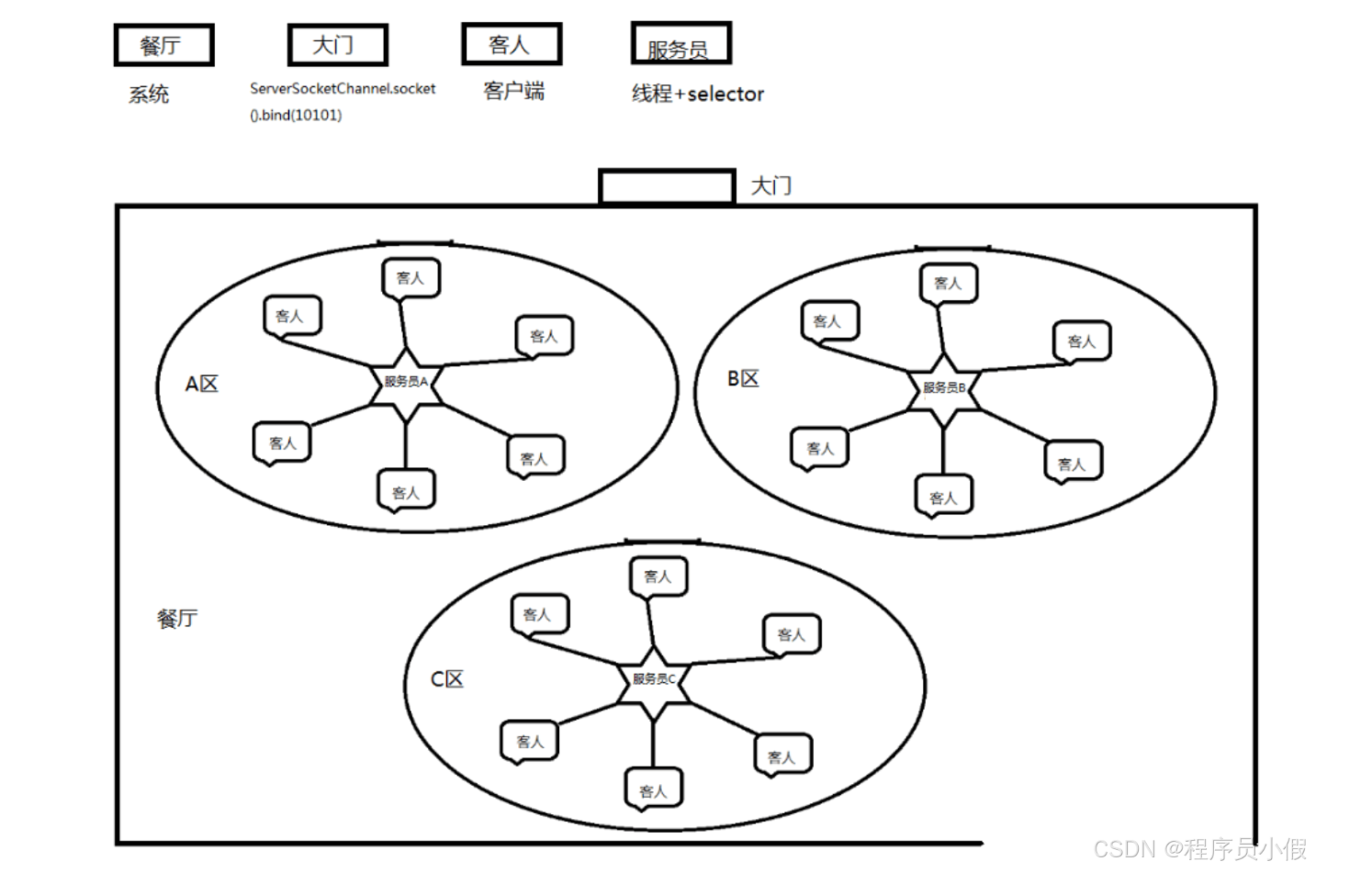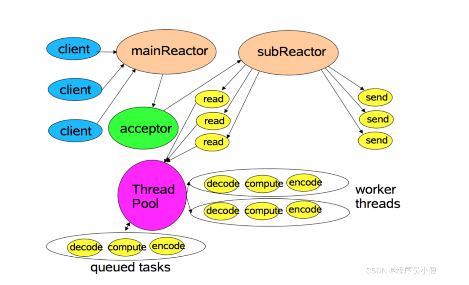 上图,简单地可以描述为”boss接活,让work干”:manReactor用来接收请求(会与客户端进行握手验证),而subReactor用来处理请求(不与客户端直接连接)。