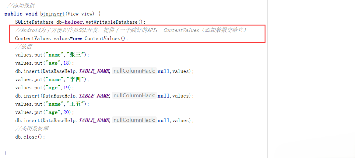 //Android为了方便程序员SQL开发,提供了一个贼好的API: ContentValues(添加数据交给它)
