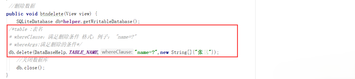 db.delete(DataBaseHelp.TABLE_NAME, "name=?", new String[]{"张三"});