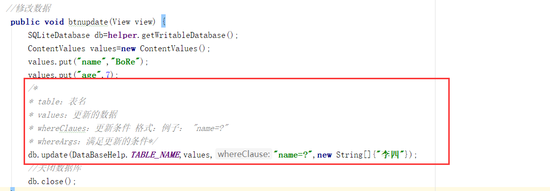 db.update(DataBaseHelp.TABLE_NAME, values, "name=?", new String[]{"李四"});