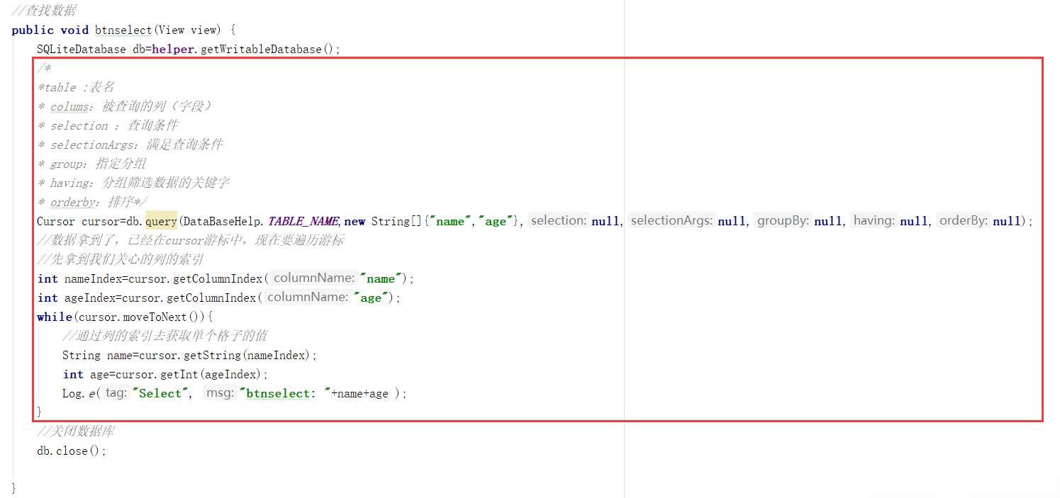 Cursor cursor = db.query(DataBaseHelp.TABLE_NAME, new String[]{"name", "age"}, null, null, null, null, null);