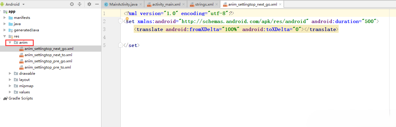 小提:动画的xml文件需放在anim文件夹中,duration为显示时间