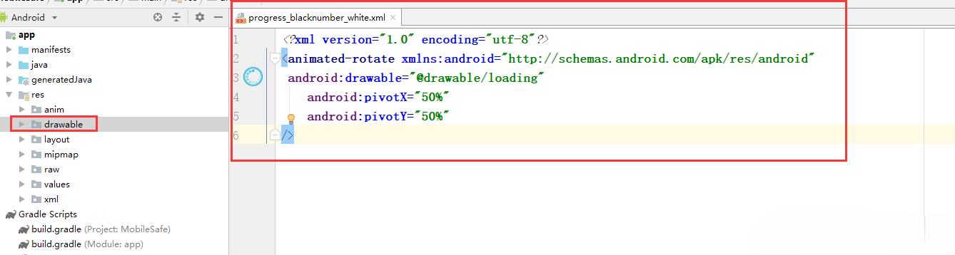 第一步:模仿源码定义一个旋转动画的xml文件,将图片改成自己想要的样子(一般动画文件应该放在anim文件夹中,但是AS中是默认放在drawable文件中的,所以我们还是放在drawable文件中)。