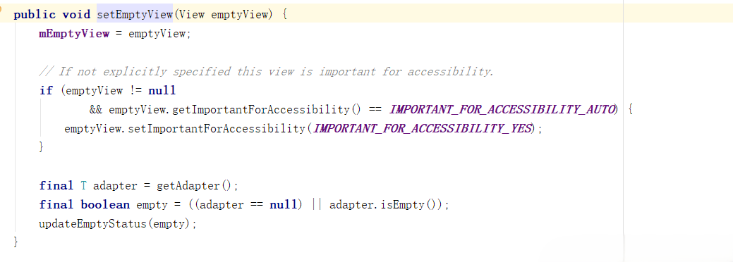 由上可知:setEmptyView把emptyView赋值到成员变量mEmptyView里,并判断adpater是不是为空,然后调用updateEmptyStatus(empty)来更新视图,