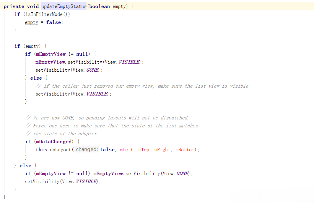 由上图可知updateEmptyStatus方法中:判断如果adapter为空,则把mEmptyView的visible属性改成显示,否则把listview显示。