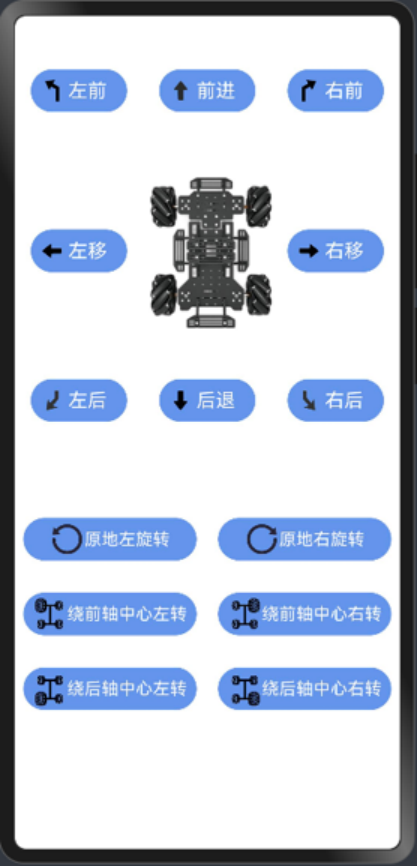 build() { Column() { Column() { Image($rawfile('mecanum_car.png')).height(200).offset({ y: 120 }) ForEach(aroundMoves, (item: Move) => { Button() { Row({ space: 5 }) { Image(item.icon).height(20).width(20).margin({ left: 10 }) Text(`${item.desc}`).fontSize(18).fontColor(0xffffff) }.alignItems(VerticalAlign.Center).width(90).height(40) } .type(ButtonType.Normal) .backgroundColor('#6495ED') .borderRadius(20) .offset({ x: item.offsetX, y: item.offsetY }) .gesture( LongPressGesture({ repeat: true, duration: 100 }) .onAction(async () => await this.moveCar(item.index)) ) }) }