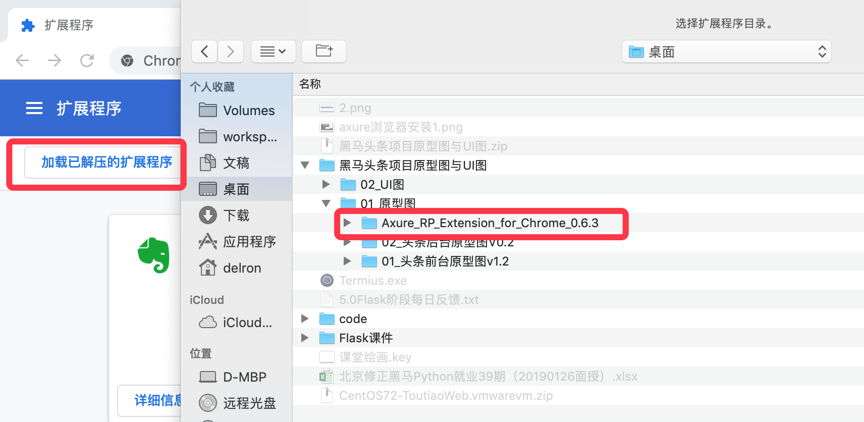 - 点击「加载已解压的扩展程序」,并选择「Axure_RP_Extension_for_Chrome_0.6.3」目录