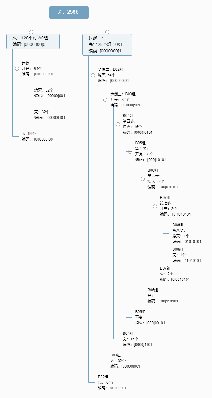 第一步操作,在总控室将其中一半的灯128个打开,那么这128个开关控制都标记为1 B0组,没有打开的控制开关标记为0, A0组.
