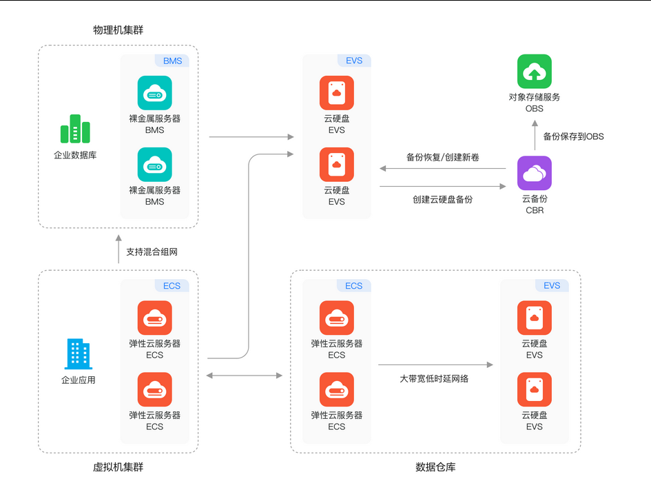 - 提供高性能块存储,支持动态扩容和快照备份,适用于数据库等IO密集型场景。