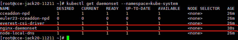 查看创建的Daemonset。此处,需要在命令行中通过--namespace=kube-system指定namespace kube.system。若不指定,则只返回默认namespace default中的资源。这个测试中只有一个Node节点,所以运行的daemonset也只有1个
