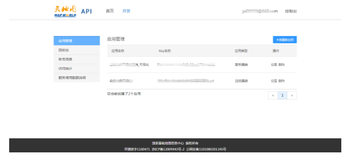 上面的公众确实要仔细查看,历史的应用需要进行调整,否则可能访问不了。经过以上的步骤我们大概就已经创建好了应用,同时可以在应用列表中看到产生的key。在访问天地图的服务时就可以带上这些key即可(按场景和应用类型分开)。