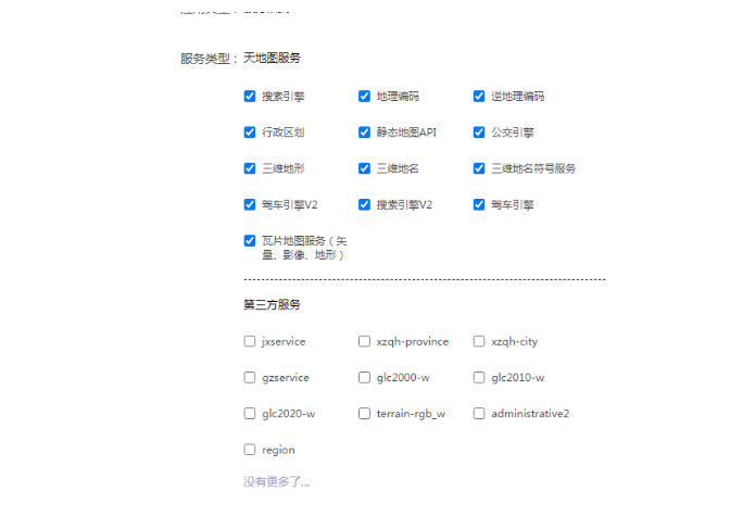 默认会包含上面这些接口,比如搜索引擎、地理编码、逆地理编码、公交引擎等。可以看到下面有一些第三方服务,暂时我们用不到,使用默认的即可。在线上服务器,我们其实可以限制访问的应用ip,不输入的话默认是不限制的。