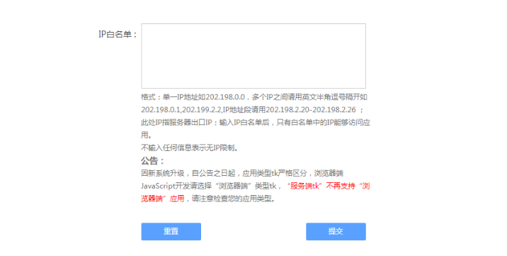 因新系统升级,自公告之日起,应用类型tk严格区分,浏览器端JavaScript开发请选择“浏览器端”类型tk,“服务端tk”不再支持“浏览器端”应用,请注意检查您的应用类型。