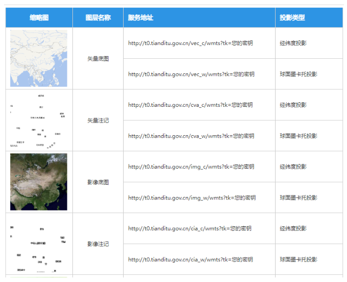 在加载天地图的地图服务之前,首先我们要知道它提供了哪些在线底图。在他的地图API页面有明确的展示。
