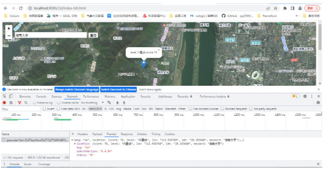 通过网络的监控,可以看到前端页面已经向后端发送请求,同时后端也及时返回了响应。到此,我们就已经实现了如何适用Leaflet进行天地图的在线底图的调用和地理编码接口的调用。相信大家都掌握了相关的知识。