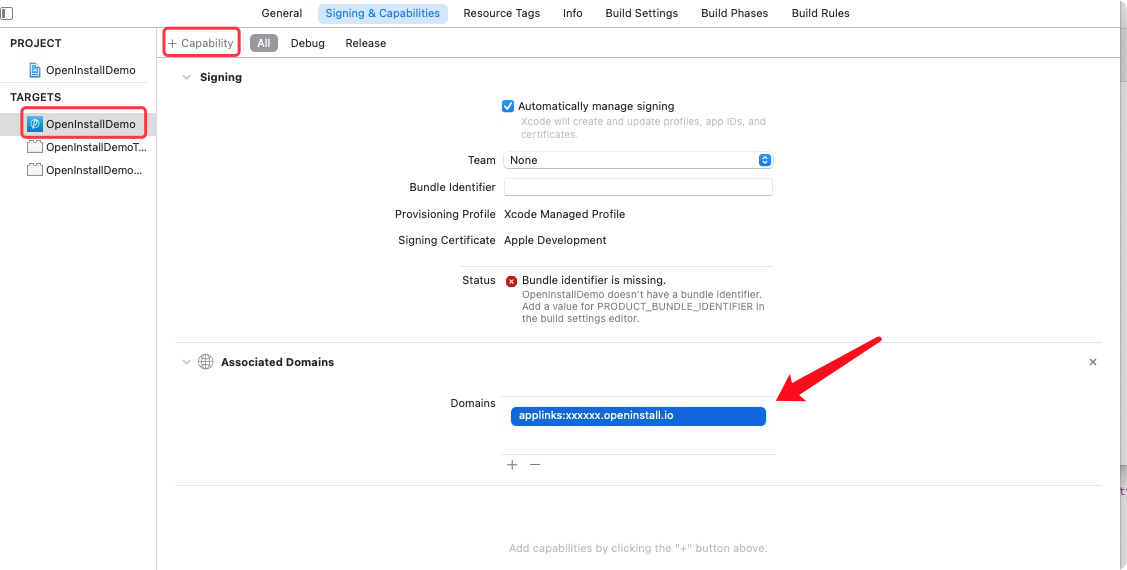 1、苹果端配置:苹果开发者后台开启通用链接,Xcode配置openinstall提供的关联域名(可配置多个不会有影响)。