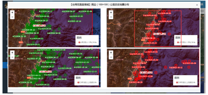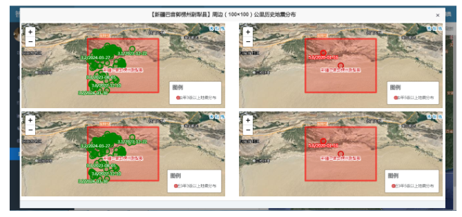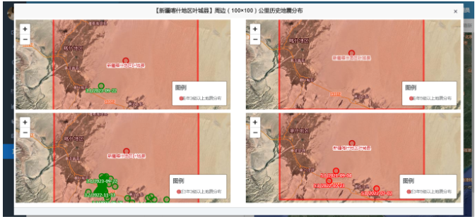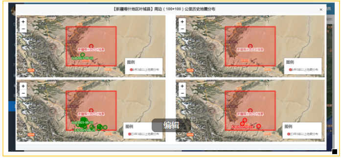 在这里我们的需求场景是,点击一个地震发生点,我们需要在四个地图上分别展示近年3级以上的地震分布、近年5级以上的地震分布、近3年3级以上的地震分布、近3年5级以上的地震分布。除了有震级的一个查询和时间的顾虑,其实这两个查询条件都不是空间分析,而震中100*100公里的矩形范围面则是标准的空间分析查询。