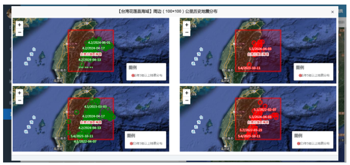 看完喜马拉雅山脉附件的地震信息,我们再来看一下太平洋板块的,我国台湾省的花莲附件海域的地震信息,这也是一个位于明显的地震带的区域。首先来看下整体情况图: