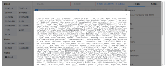 点击“生成json”按钮可以将动态表单转成json,这样我们就可以把表单存储到数据库中,实现动态的管理和配置。来看下json的表单生成结果。