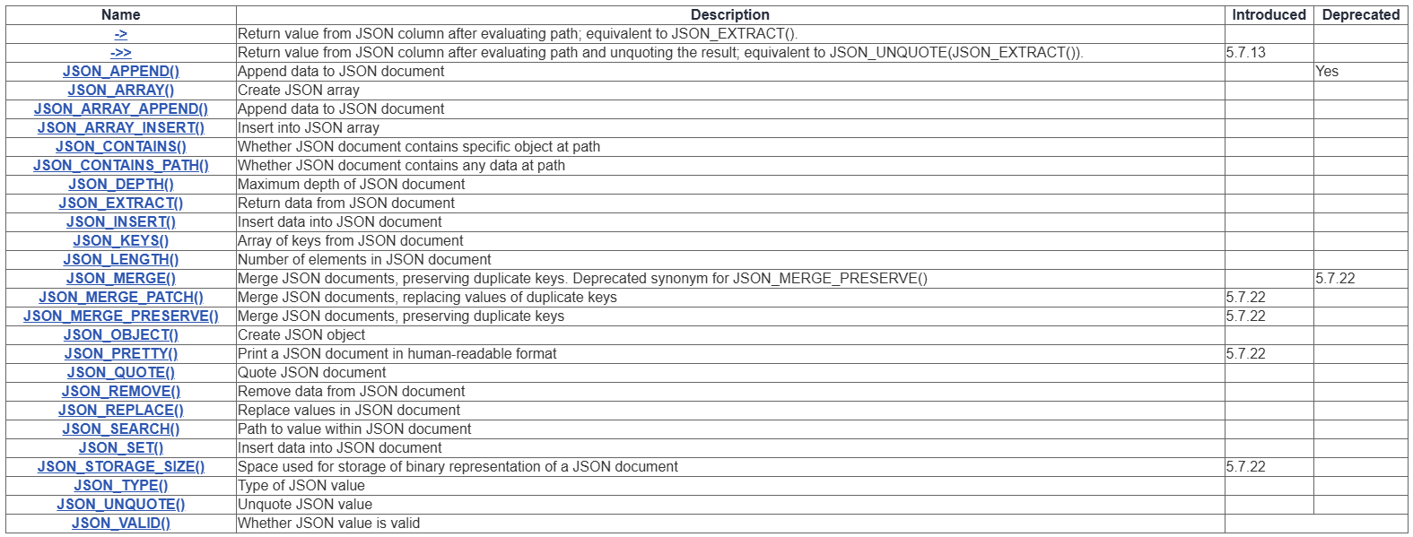 在使用上面的sql脚本将数据插入到数据库之后呢,我们怎么把页面的表单给精准的查询出来呢?实现我们最初的需求呢。这里就需要介绍一下在MySQL中的JSON数据的查询问题。在MySQL5.7中关于JSON的方法参见其官网的定义: