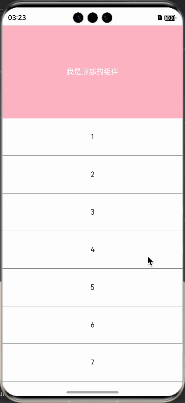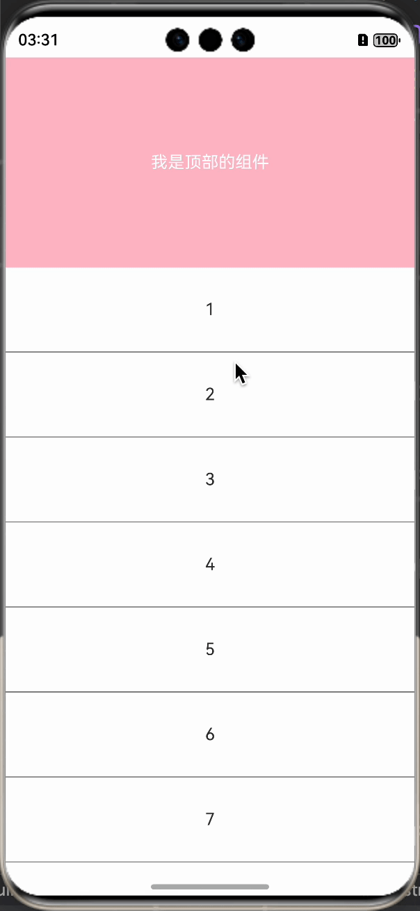 我们想要的效果是,先让顶部的组件滚动上去,然后再滚动下面的List组件,我们运行看下效果: