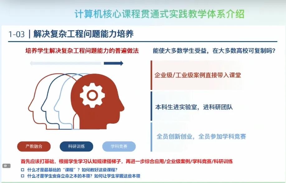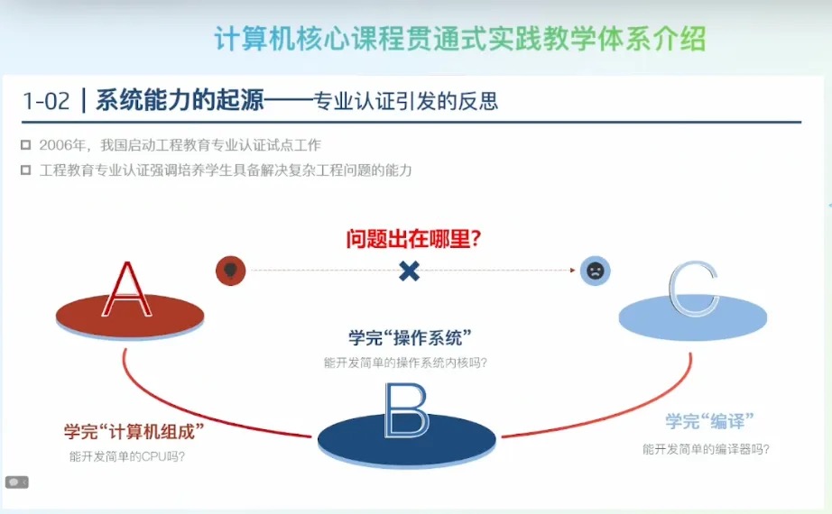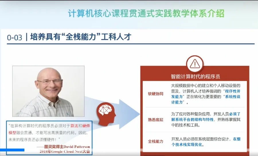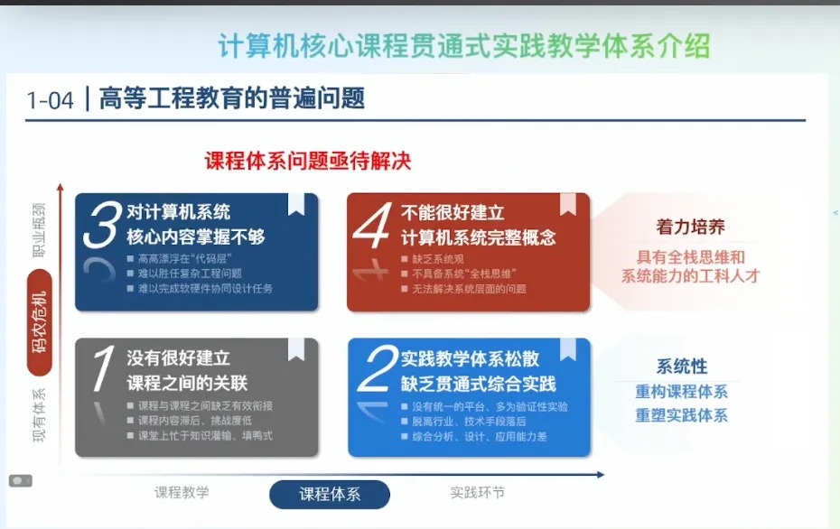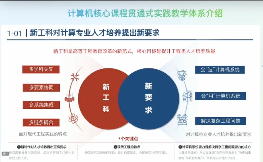 - 计算机系统能力是解决工程问题能力的核心:计算机系统能力从过去强调“程序性开发能力”向更加重要的“系统性思维”和“系统性设计能力”转变。