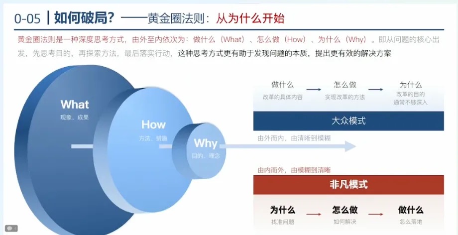 黄金圈法则是一种深度思考方式,由外至内依次为:做什么(What)、怎么做(How)、为什么(Why)。即从问题的核心出发,先思考目的,再探索方法,最后落实行动,这种思考方式更有助于发现问题的本质,提出更有效的解决方案。