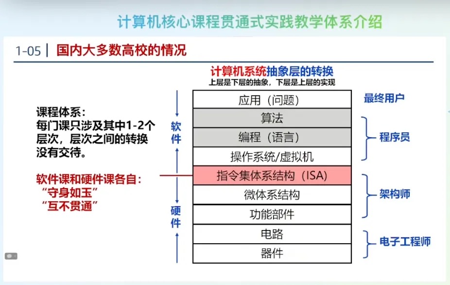 - 课程体系:每门课只涉及其中1-2个层次,层次之间的转换没有交待。