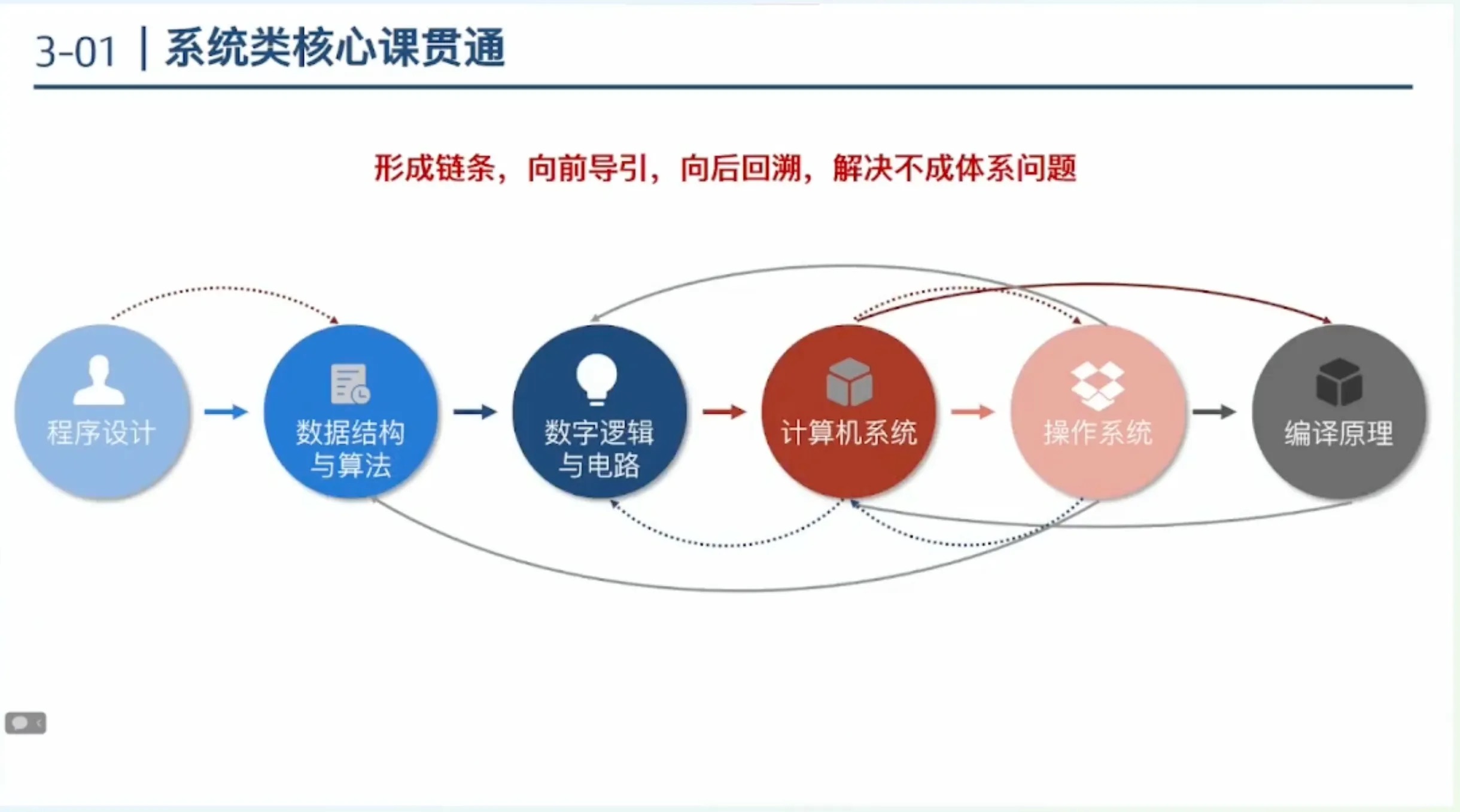 系统类核心课贯通,形成链条,向前导引,向后回溯,解决不成体系问题。
