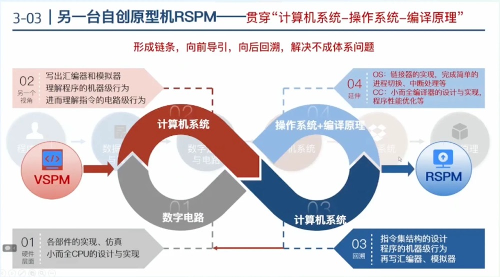 另一条原型机,RSPM,它有四十条指令。它主要用于贯穿“计算机系统”到“操作系统+编译原理”课程。