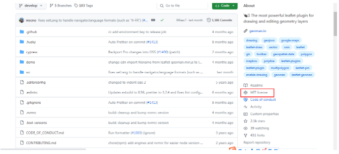 可以看到,在github上面,leaflet-geoman这个项目的start 数已经有2.1k,作为一个前端组件,尤其是面向webgis的前端组件,非常厉害了。下面我们结合它的官网资料来进行一些简要介绍。让您提前了解一些知识。