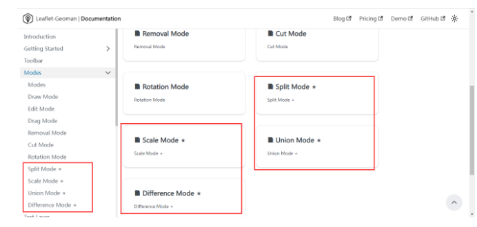 虽然这款软件是开源的,但是其还是有开源版和企业版的区别,关于这两个版本的主要差别,在Leaflet-geoman的官方文档上有简要的说明。与市面上大多数的软件一致,企业版的功能比开源版的要多一些,这也是正常的。企业版(pro)版的功能要比开源版强大一些。如果您在平时的工作中确实需要这些新特性,那不妨去支持一下这个项目。企业版的不同之处主要分几个方面,第一个方面是企业版支持的模式多一些,如下图所示: