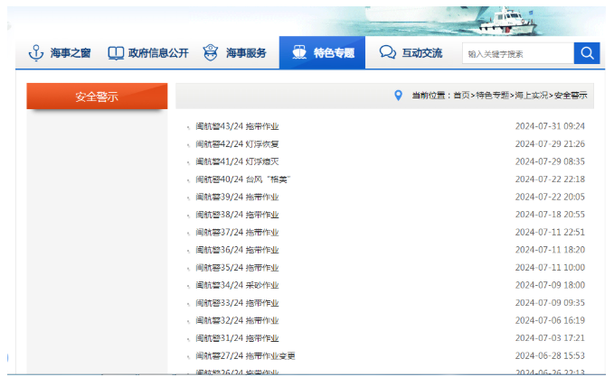 通常而言,海事部门如海事局,通常会在所述的管辖区域内进行航行管控。比如会在海面上进行采砂作业、或者是拖带作业、人员落水、沉船碍航等作业需求。这些消息通常会先由各海域属地的海事局进行消息的发布,可以在他们的官方网站上看到,如以下的信息: